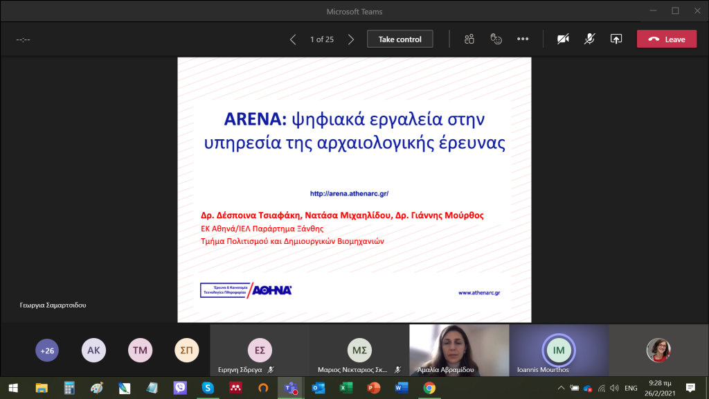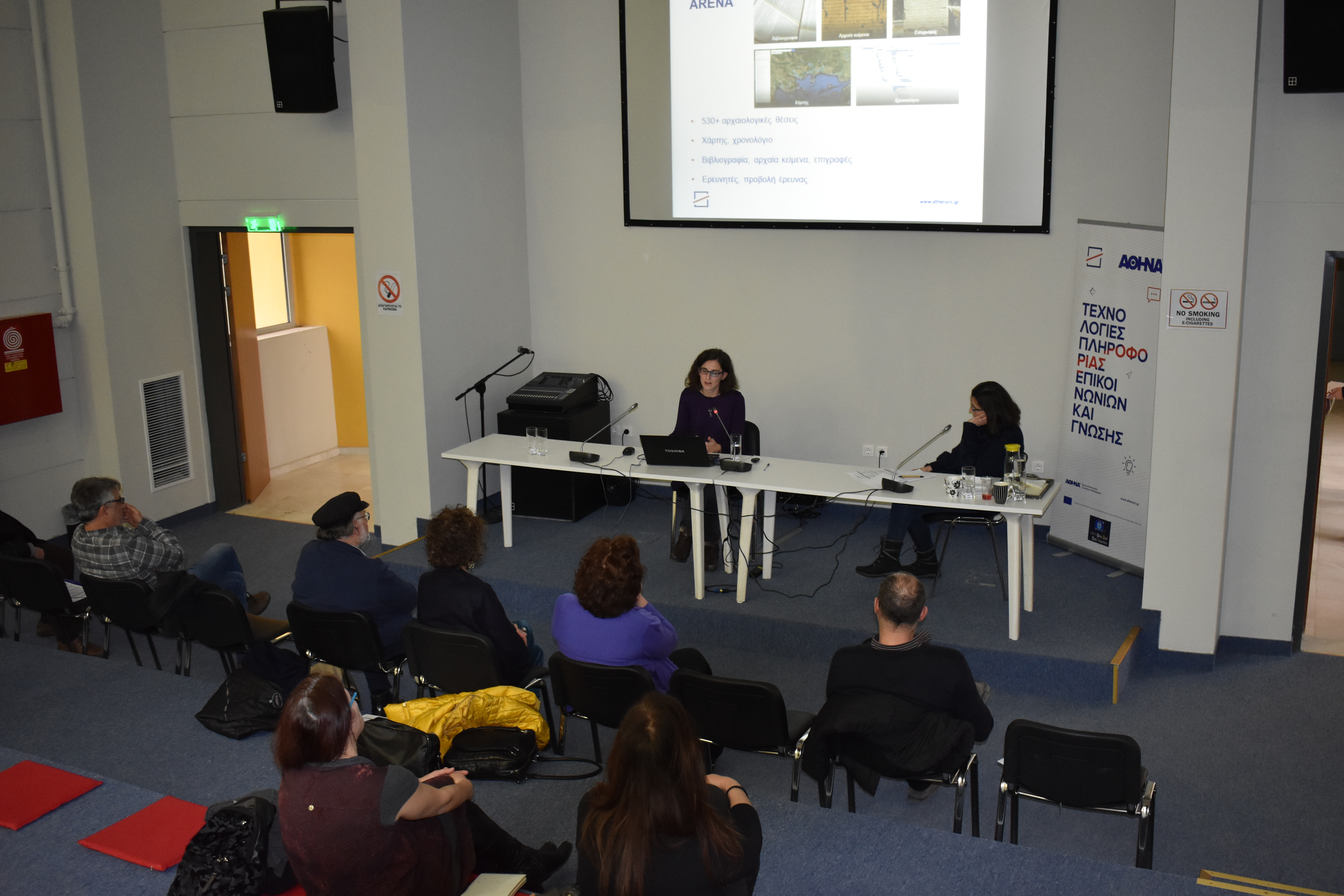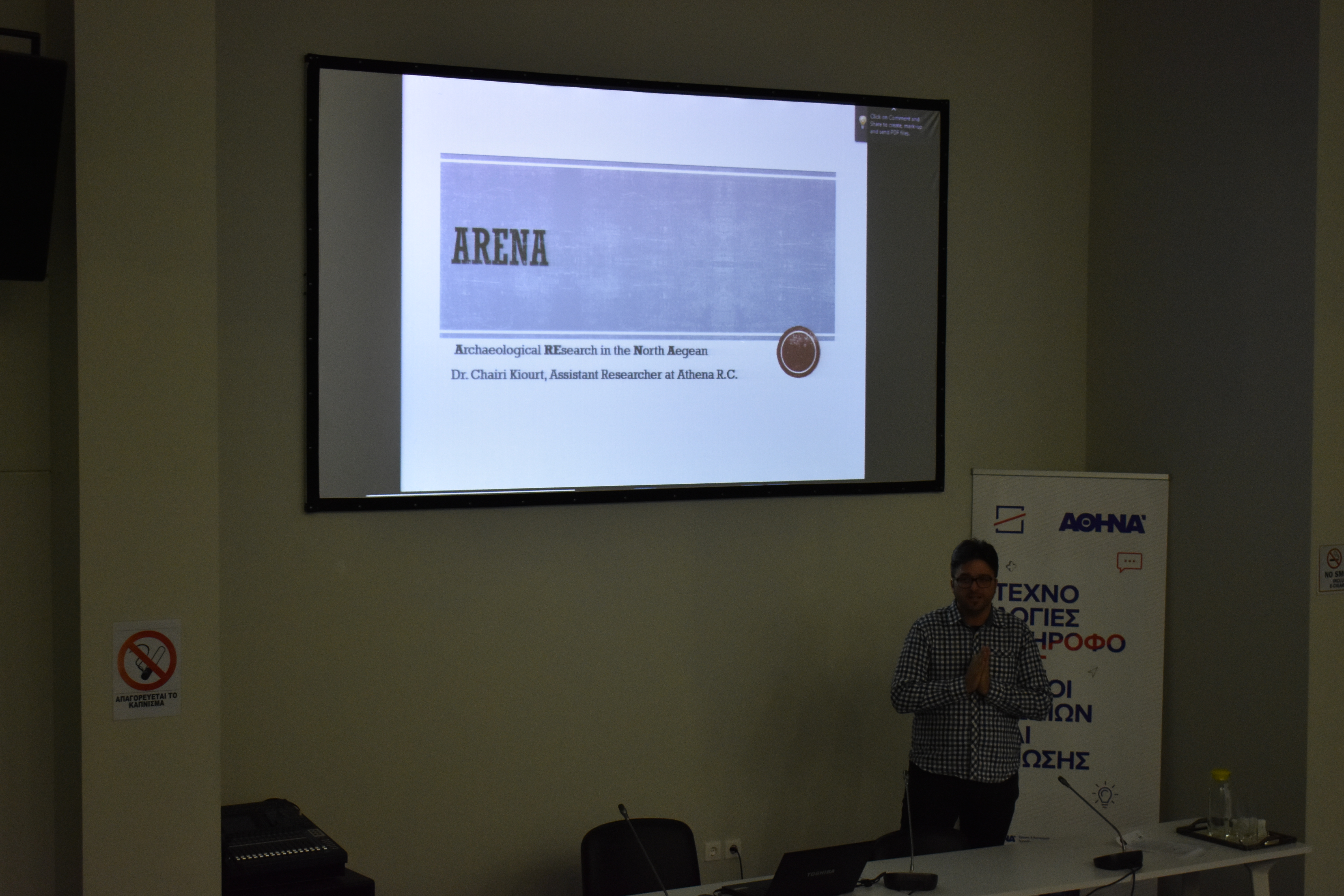 Στο πλαίσιο του μαθήματος “Αττική Κεραμική” που διδάσκει η κα. Αμαλία Αβραμίδου, Επίκουρη Καθηγήτρια στο Τμήμα Γλώσσας, Φιλολογίας και Πολιτισμού Παρευξείνιων Χωρών του Δημοκριτείου Πανεπιστημίου Θράκης, παρουσιάστηκε στους φοιτητές, από τους συνεργαζόμενους ερευνητές του Ε.Κ. “Αθηνά” Ν. Μιχαηλίδου και Γ. Μούρθο, το ερευνητικό έργο ARENA και η δυνατότητα αξιοποίησής του για ερευνητικούς σκοπούς.