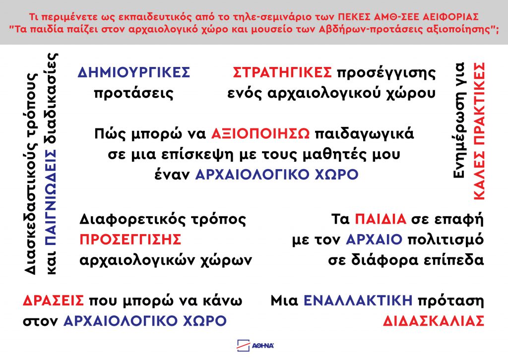 - Τηλε-σεμινάριο μουσειακής αγωγής με τίτλο «Τα παιδία παίζει στον αρχαιολογικό χώρο και μουσείο των Αβδήρων-προτάσεις αξιοποίησης», 24/6/2020